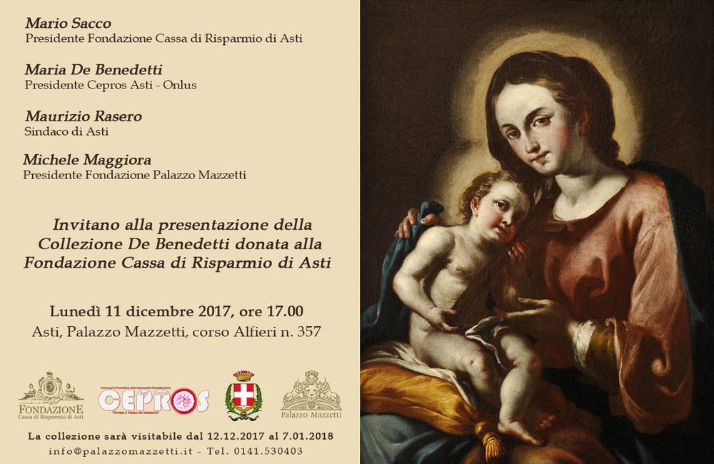 Primo anniversario della scomparsa, la Fondazione Cassa di Risparmio di Asti e la Fondazione Palazzo Mazzetti renderanno omaggio al Prof. Paolo De Benedetti – teologo e biblista – con l’esposizione di dipinti antichi e moderni donati da lui stesso e dalla sorella, la Prof.ssa Maria De Benedetti, alla Fondazione Cassa di Risparmio di Asti. Le opere rimarranno esposte dal 12 dicembre 2017 al 7 gennaio 2018.