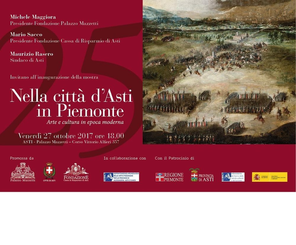 Fondazione Palazzo Mazzetti, Fondazione Cassa di Risparmio di Asti e Città di Asti invitano all’inaugurazione della mostra “Nella città d’Asti in Piemonte”. Arte e cultura in epoca moderna, che avrà luogo venerdì 27 ottobre alle ore 18 a Palazzo Mazzetti (Asti, Corso Vittorio Alfieri, 357).